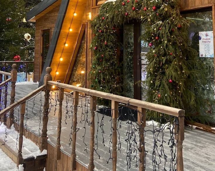 Перед входами советуют установить ели, добавить украшения из хвои и шаров, а при благоприятной погоде — ледяные или снежные фигуры.