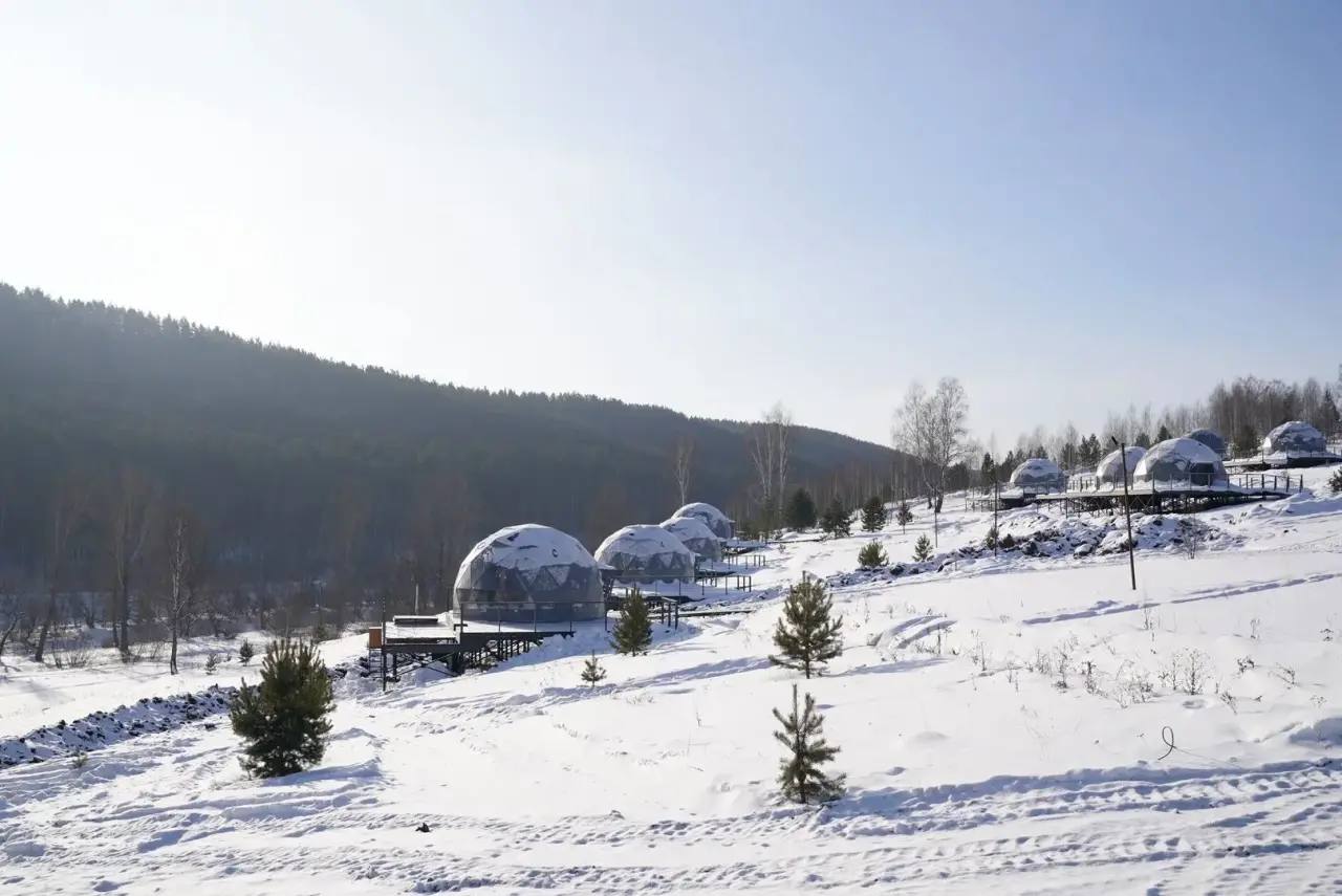 На территории уже возвели 10 жилых модулей, панорамный ресторан и общежитие для персонала. В дальнейшем здесь хотят расширить возможности размещения гостей, а также построить кинотеатр, офисные корпуса и банный комплекс.